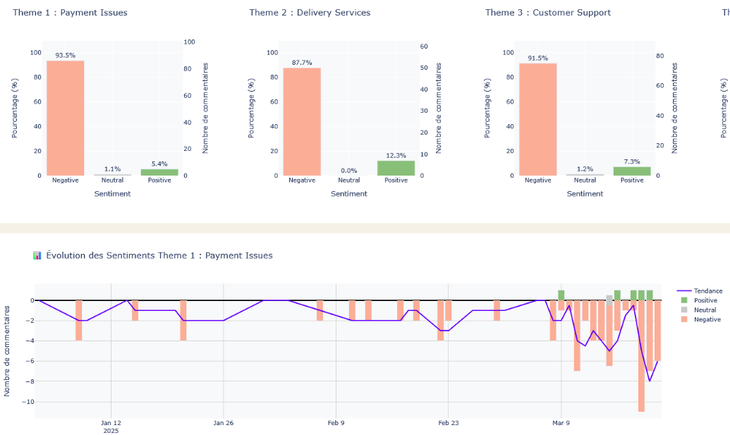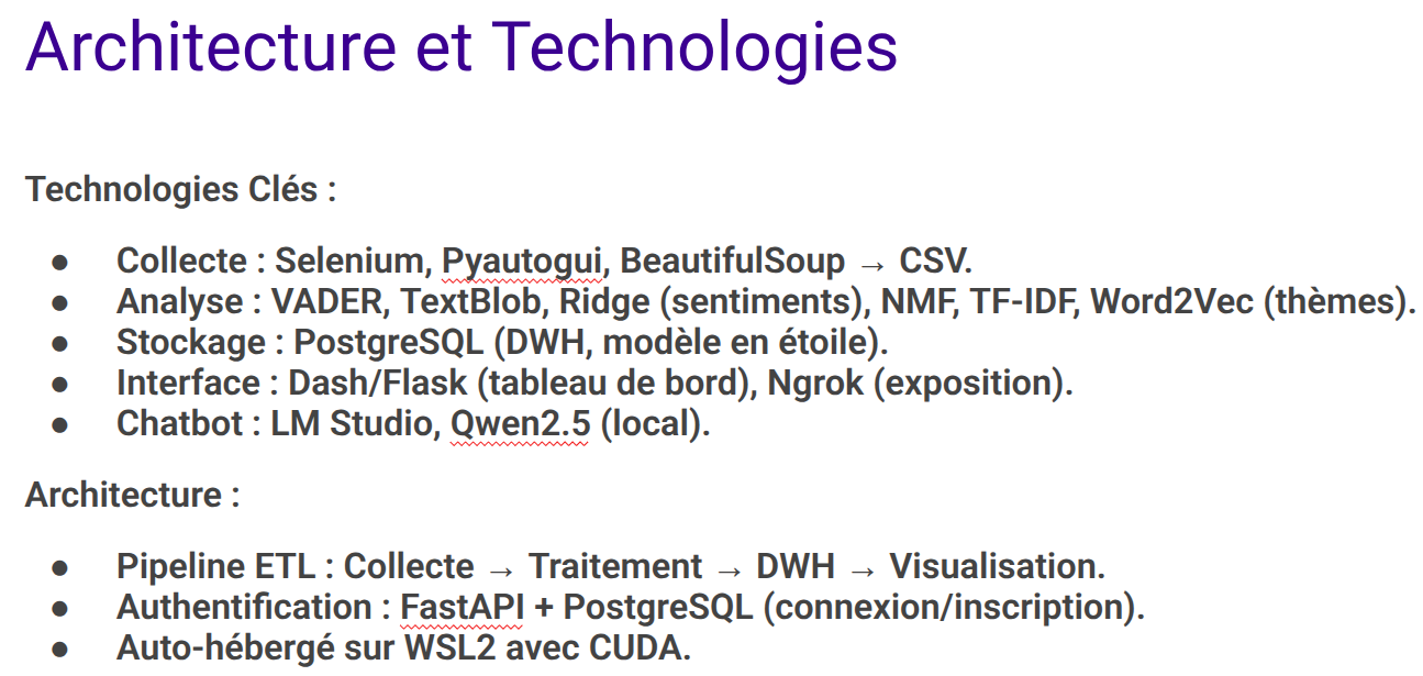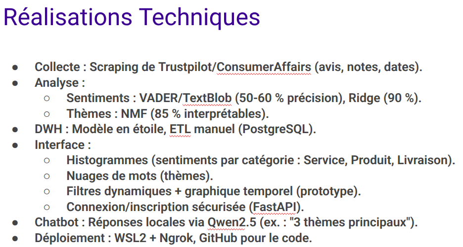 Conception et développement d’une plateforme data complète permettant de collecter, structurer, analyser et visualiser des données textuelles issues de sources hétérogènes (Trustpilot, ConsumerAffairs) afin d’analyser la perception d’une entreprise ou d’une personnalité. Ma contribution sur le projet repose sur la conception de pipelines ETL en Python automatisant l’extraction, la transformation, les contrôles qualité et l’enrichissement des données, avant leur structuration dans des modèles analytiques exploitables. Les données sont exposées via des tableaux de bord interactifs et sécurisés, facilitant la restitution claire d’informations et la prise de décision par des utilisateurs non techniques. L’architecture a été conçue pour être exploitable, supervisable et évolutive, avec une gestion des accès.